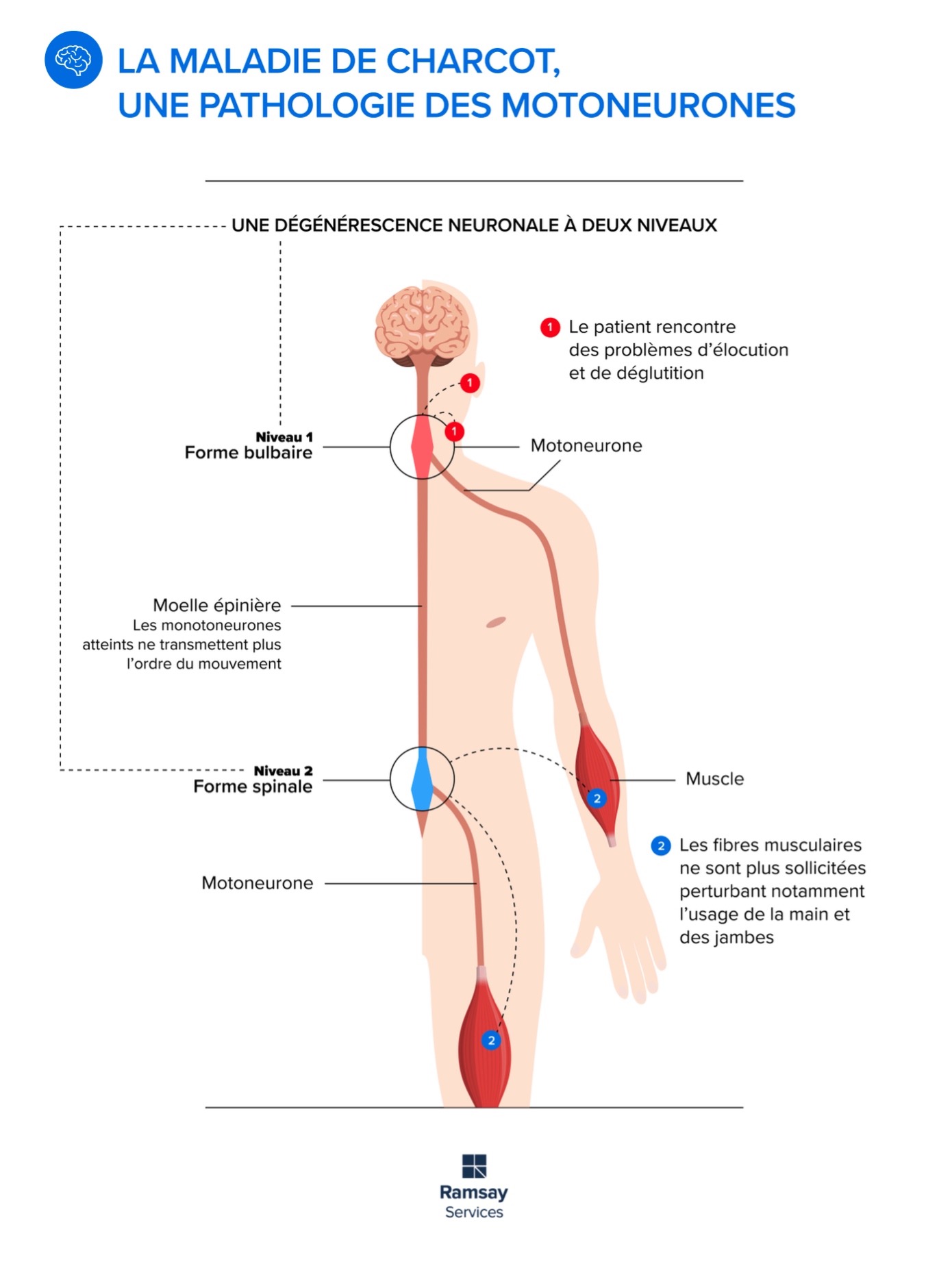 La maladie de Charcot, aussi appelée sclérose latérale amyotrophique, est une maladie rare et grave du système nerveux. Elle touche les motoneurones, des cellules du cerveau et de la moelle épinière qui contrôlent les muscles. Quand ces cellules meurent peu à peu, les muscles ne reçoivent plus les ordres nécessaires pour bouger. Cela entraîne une faiblesse musculaire, des difficultés à parler, à avaler, puis à respirer. Le corps devient de plus en plus faible, alors que les capacités intellectuelles et la mémoire restent intactes. C’est une maladie qui bouleverse profondément la vie des personnes atteintes et de leurs proches.